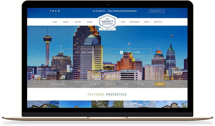 Finding the right home in the Lone Star State’s second most populous city is no longer a daunting affair, thanks to the accommodating design of The Agency San Antonio’s real estate website. An action-oriented home screen welcomes every site visitor, with distinct buyer- and seller-oriented buttons set front and center, while a detailed quick search bar is present at the bottom edge. In addition, highlight properties and communities are showcased immediately below the fold.