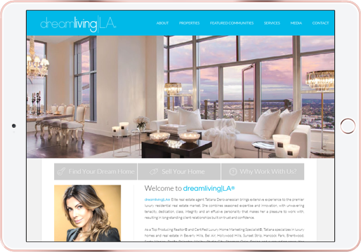 Tatiana Derovanessian’s website boasts of a chic, yet relaxing vibe through its cerulean and white palette, simple layout, and striking photographs. Her website highlights the world-class service that she offers, making her the go-to resource for Los Angeles luxury real estate.