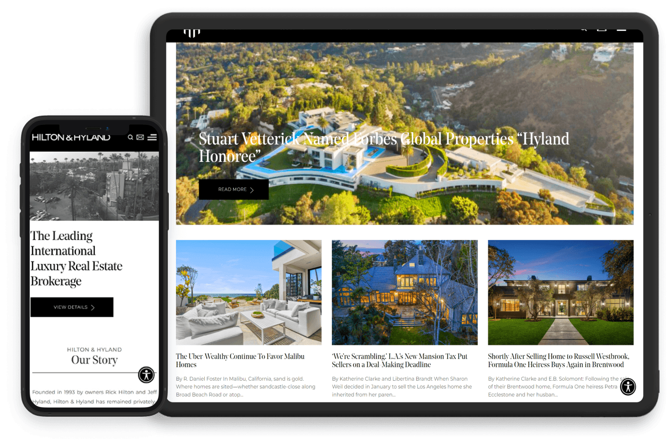 Beverly Hills, CA“Show don’t tell” is the design philosophy behind HiltonHyland.com. With a cinematic banner video that features expansive estates, palm-tree-lined streets, and breathtaking hillside vistas, the message is clear: Hilton & Hyland are masters of luxury LA real estate. Its classic black-and-white color palette embodies “quiet luxury” long before it became a pop culture buzzword.